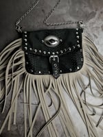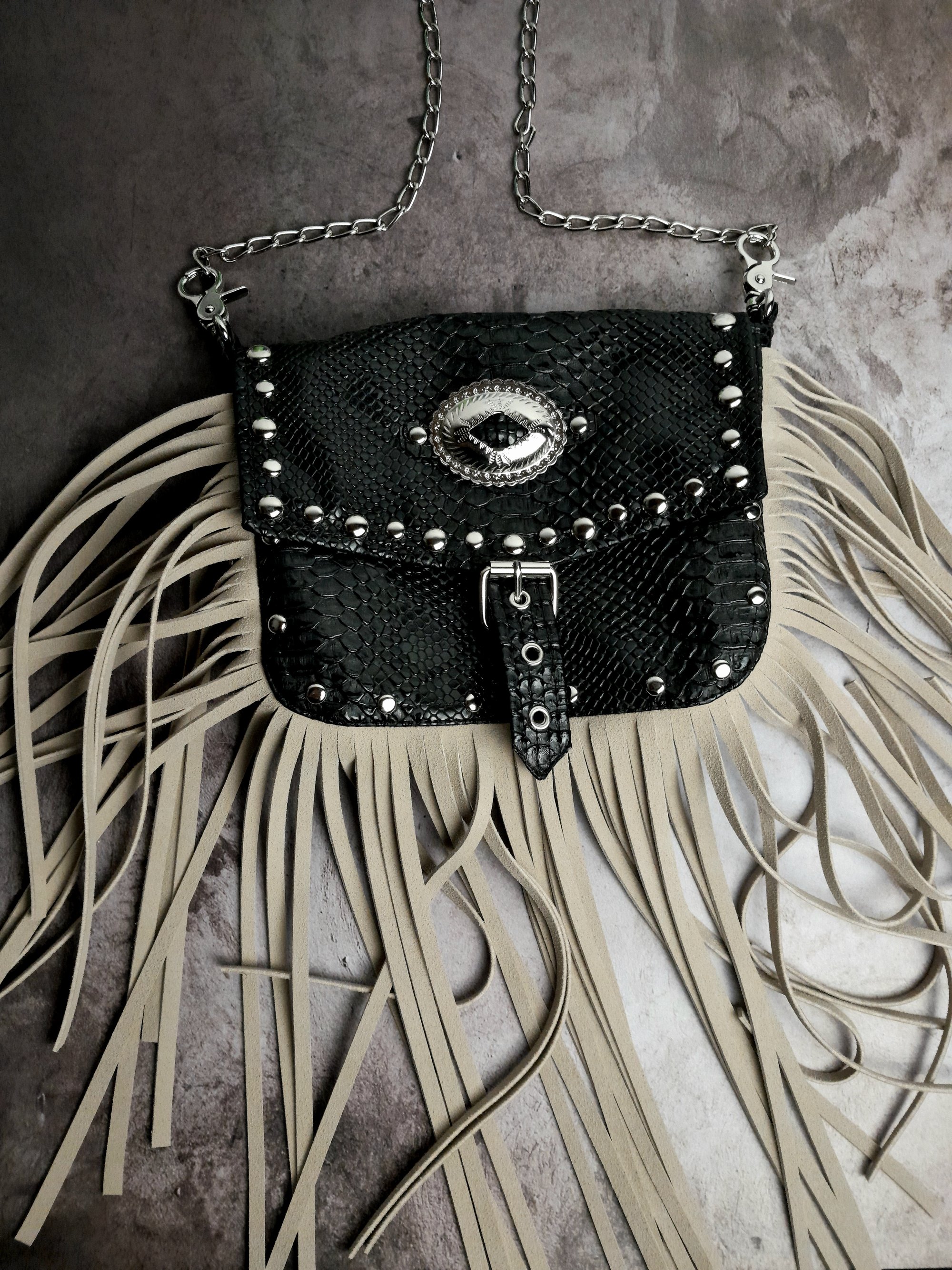 Faux black snake leather purse with 25cm handcut beige faux suede fringe, concho and 2size silver dome studs.