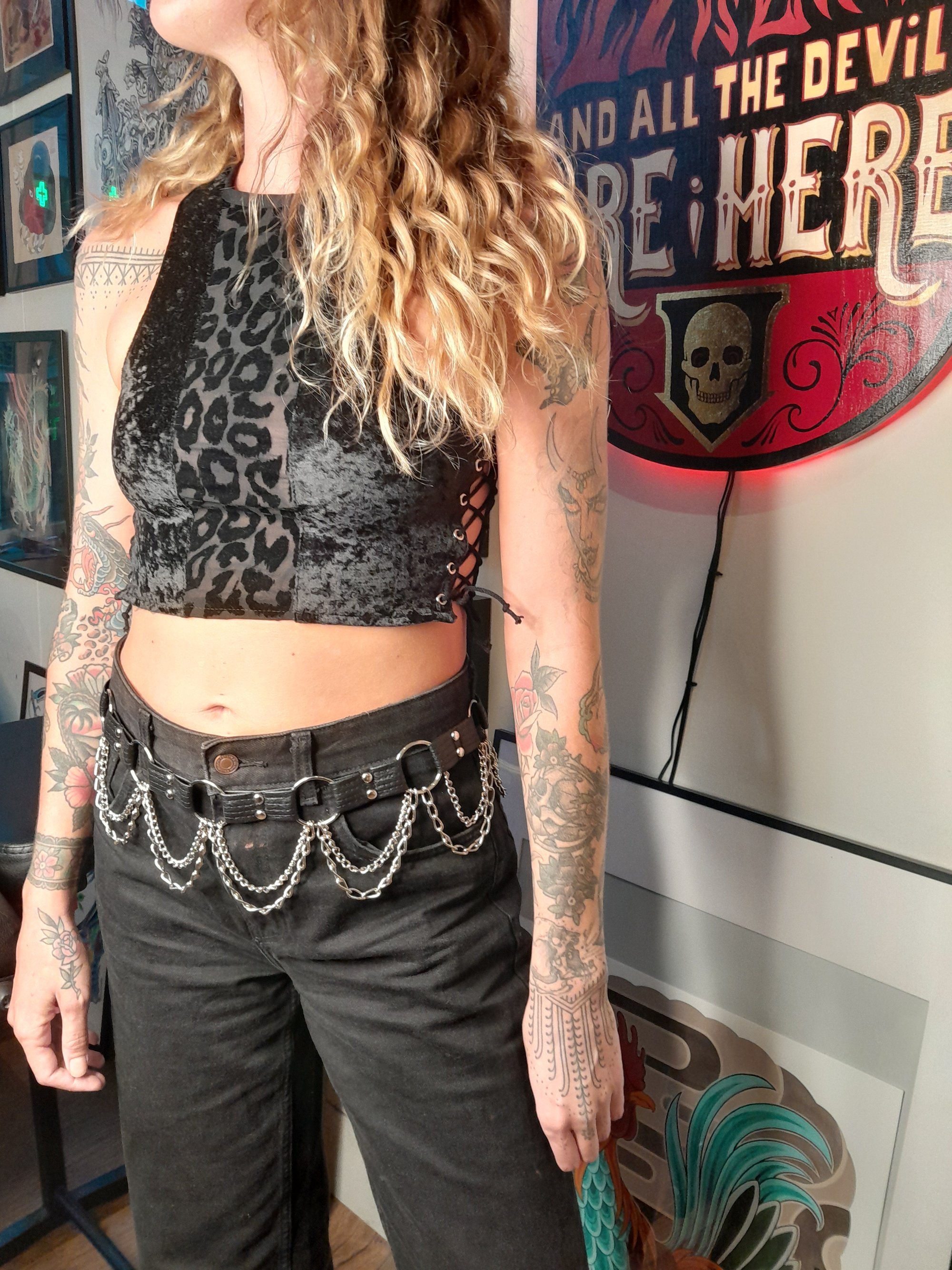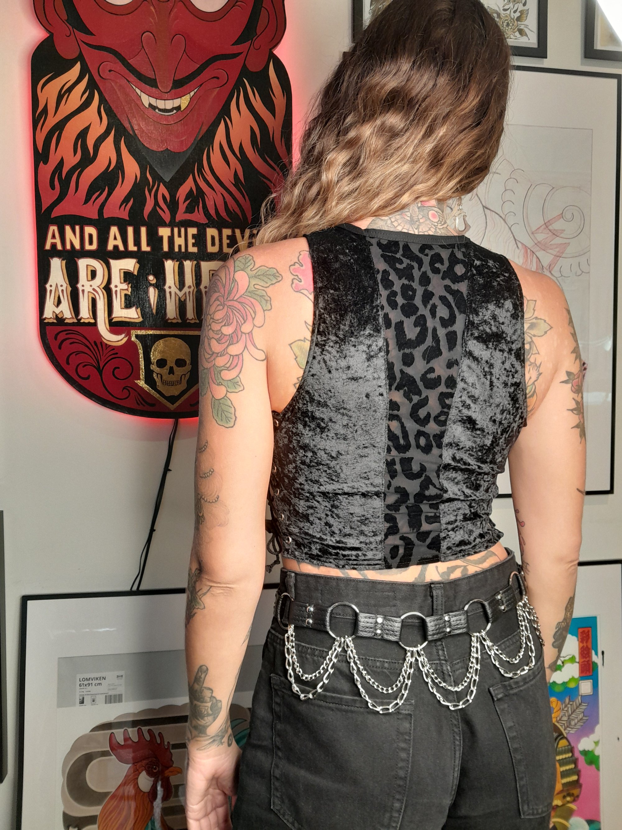Black Velvet top combined with velvet leopard mesh center part in front and back panel, finished off by laced sides.