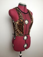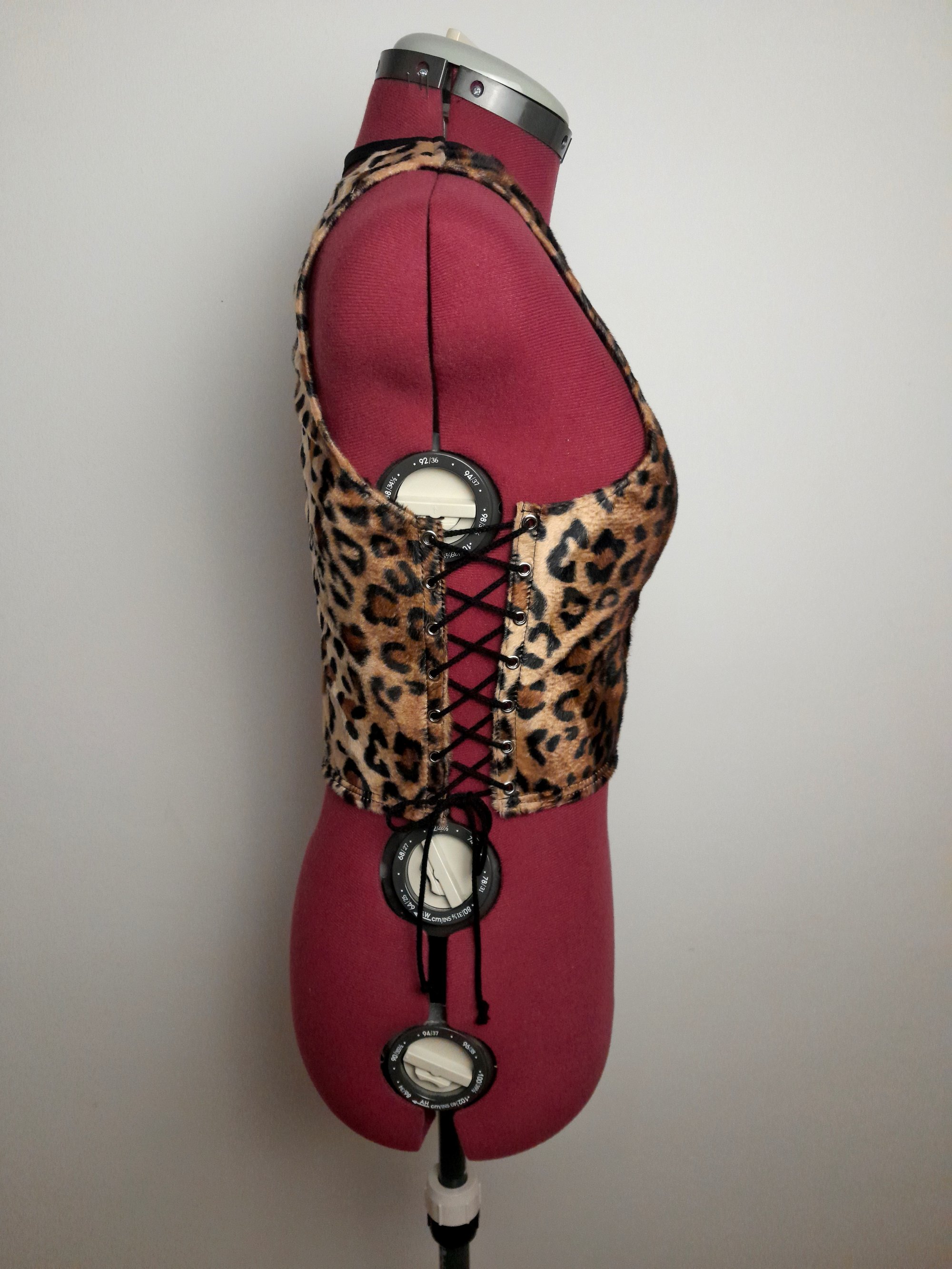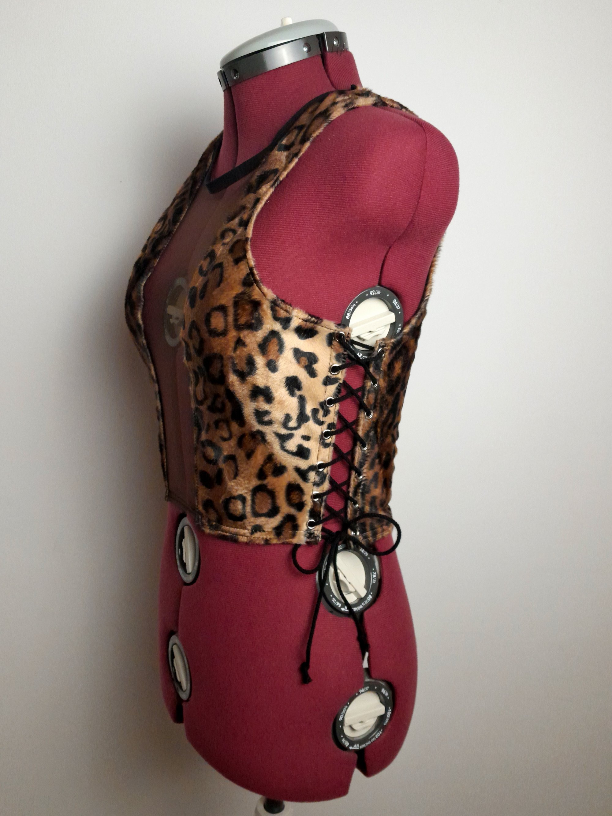 Leopard faux fur top combined with dark brown mesh center part in front and back panel, finished off by laced sides.
